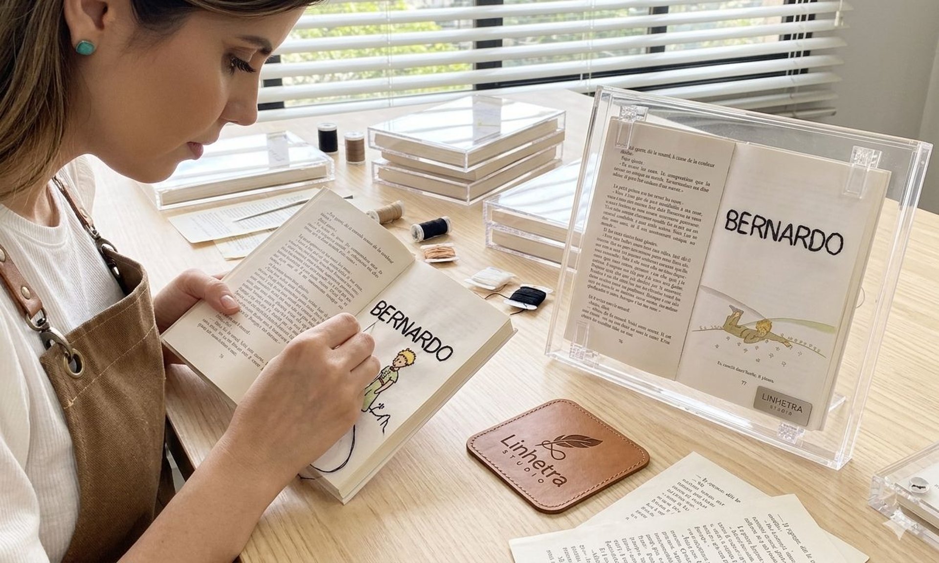 Na Linhetra Studio, os livros deixam de ser apenas páginas percorridas. Tornam-se matéria, forma, permanência. Sob suas mãos, ponto a ponto, as palavras são atravessadas por linhas — e o que antes era lido passa a ser contemplado.